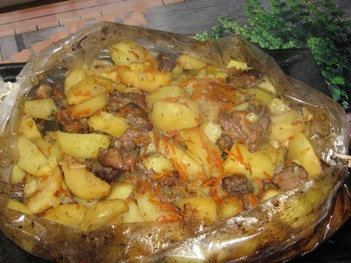 Сам процес: м’ясо ріжемо кубиками та рівним шаром викладаємо в рукаві. Зверху – шар цибулі кільцями, зверху – шар наступного подрібненого овочу… Ну, ви зрозуміли принцип. Якщо це свинина або яловичина, помаринуємо в холодильнику і випікаємо годинку при 200 градусах. Якщо курка, то процес прискорюється. Поїдаємо за читанням Джерома нашого Джерома.