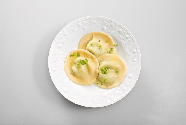 - Тісто (вже холодне) дуже тонко розкочується, ріжеться склянкою на круги, в які начинка розкладається. Формуються акуратні равіолі.