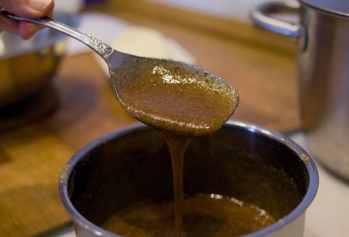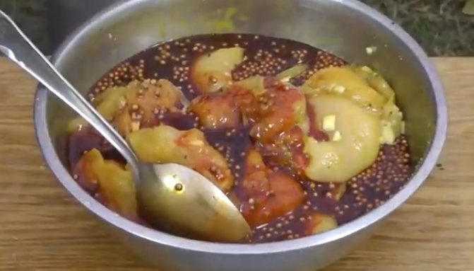 - Для того щоб маринад вдався, потрібно додати до спецій рідкий мед. Якщо він затвердів від цукру, його можна трохи розтопити, використовуючи водяну лазню. Вливаємо розтоплений мед у банку.