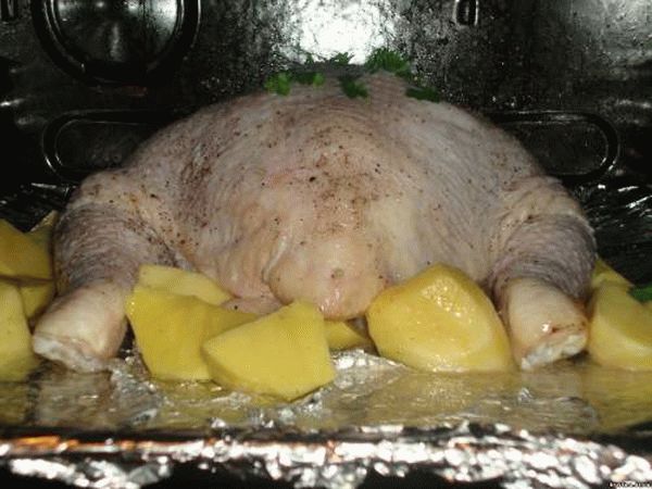 - Залишається тільки засмажити курку в духовці. Промариновану тушку потрібно укласти спинкою вниз на деко з невеликою кількістю олії. Навколо неї розкласти шматочки картоплі, присолити і змастити залишками маринаду.