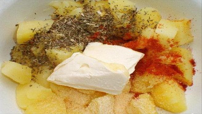 Картоплю почистити та відварити в підсоленій воді до готовності, злити рідину. Посолити, всипати перці або набір спецій, покласти вершкове масло|мастило| і розім’яти в пюре.