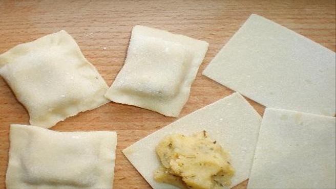 На один бік кожного прямокутника покласти гостру картопляну начинку і накрити другою половиною. Краї надійно защипнути.