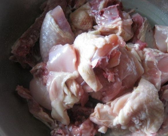 - Порізати курча на малі шматочки, приблизно по півтора сантиметри. Додати дві чайні ложечки соєвого соусу, стільки ж шаосинського вина, 1 ч. л. кукурудзяного крохмалю. Все ретельно перемішати, покласти маринуватись на півгодини.