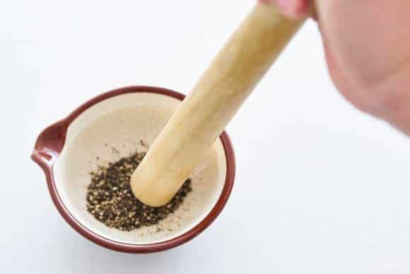 - Потовкти маточкою у ступці 1 ст. л. сухого сичуаньського гострого перцю. Змішати з ним зелень нарізаної цибулі, відклавши поки що світлі частини.