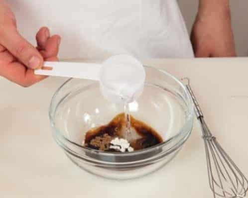 - Невикористаний Sen Soy, рисове вино та крохмаль розмішати у новій мисці. Покласти туди по 1 ст. л. чорного китайського оцту та Чилі-пасти, а також 1 ч. л. цукру. Змішувати масу доки розчиниться весь крохмаль. Спеціальний соус для курки готовий, він знадобиться у рецепті пізніше.