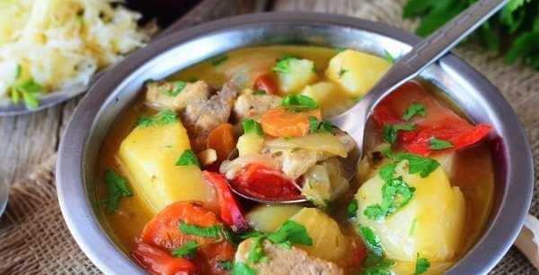 Цю страву можна вживати на вечерю чи обід замість гарячого супу. Загальний час приготування складає в середньому 1-1,5 години. Оскільки в даному рецепті відсутні алергенні продукти, страву можна включати в меню харчування для дітей. Розпочати процес необхідно з підготовки м’яса. Його потрібно нарізати на шматки середнього розміру та відправити у каструлю з товстими стінками. Якщо є казан, краще використовувати його. На дно посуду слід налити трохи олії і відправити її на помірний вогонь. М’ясо потрібно обсмажувати протягом 5-10 хв.
