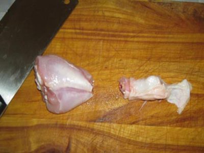 • Охолоджені курячі стегна обережно звільніть від кісток, намагаючись не порвати шкірку і не розрізати верхній шар м’яса.