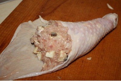 • Цією масою начиніть шкірку від стегенець, але не сильно щільно, а то при приготуванні вона лусне.
