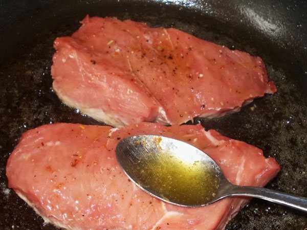 4. Саме час викласти свинину. Смажимо стейки на максимальному вогні по 4 хвилини. Потім зменшуємо до середнього та готуємо ще по 5 хвилин з кожного боку.