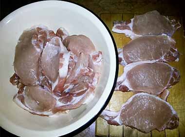 • М’ясо. Використовується свиняча вирізка, шия, поперековий відріз, реберний, філейний. Загалом будь-який шматок без жил, кісток, варіантів дуже багато, насправді близько 100 видів і це ціла наука, але для домашньої страви необов’язково її освоювати і вникати у всі тонкощі. Нарізається свинина завжди поперек волокон завтовшки близько 1-2 см. Тонкі стейки робити не потрібно, тому що вони вийдуть сухими відбивними.