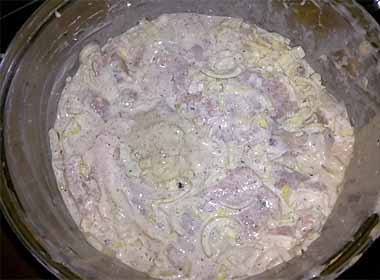 6. Приготувати миску. Викласти шарами м’ясо, чергуючи його з цибулею та сумішшю сметани та кефіру.