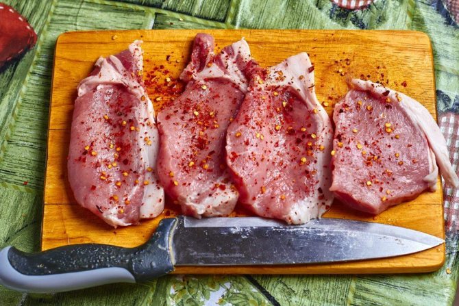 Найчастіше для свинячих стейків використовують лопатку, стегно чи відбивні. Якщо якийсь із представлених висівок буде складатися з довгих волокон, м’ясо просто розрізають поперек волокон. Шматки мають бути від 2,5 до 4 див.