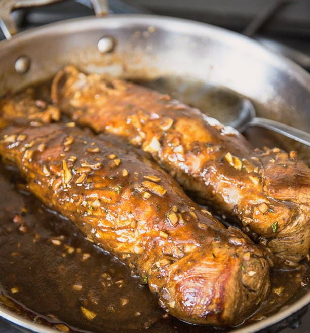 5. Доведіть маринад до кипіння, накрийте фольгою сковороду і відправте в духовку. Зауважте, щоб на сковороді не було пластикових частин. Запікайте свинину за 190 градусів 15-20 хвилин.