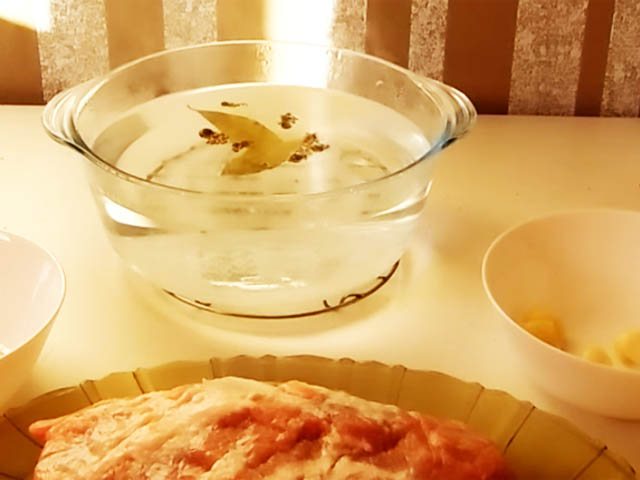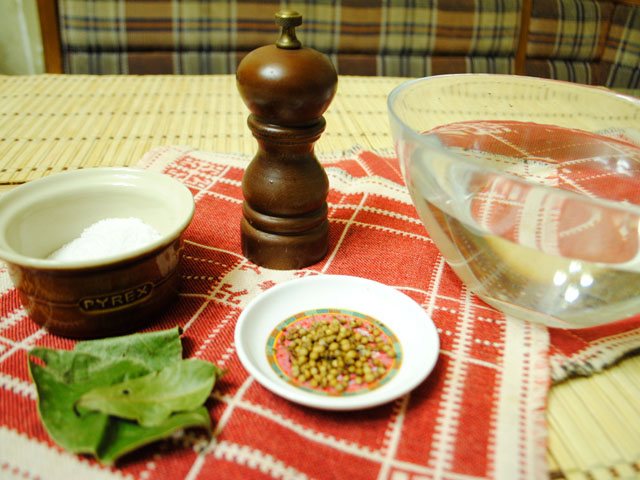 1. Закип’ятити воду. Додати до неї сіль, поламаний на частині лавровий лист, коріандр та перець горошком. Прокип’ятити всі разом 2 – 3 хвилини та вимкнути газ. Дати можливість воді повністю охолонути та насититися ароматом спецій.