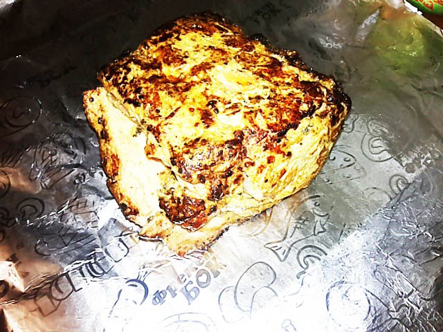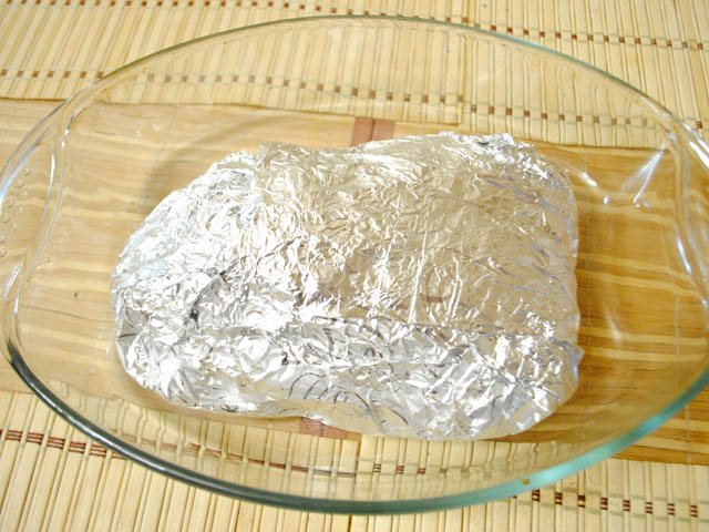 9. Тепер загорніть свинину у два шари фольги. Покладіть пакунок на лист або форму для запікання. Духовку розігрійте до 180 градусів. І поставте м’ясо запікатись на 1,5-2 години.