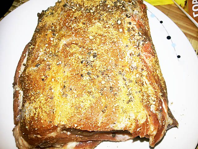 Обсипати ними шматок з усіх боків. Також обсипати сіллю. Втерти те й інше у м’якоть.
