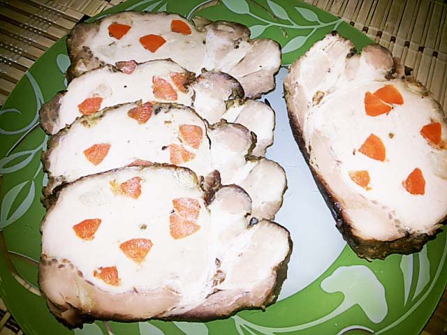 Свинина запечена в духовці не обов’язково має бути виключно великим шматком. Як можна пройти повз інший варіант її приготування у вигляді рулету. Береться той же шматок свинячої шиї на 1,5-2 кг і розрізається по спіралі, додається начинка і м’ясо згортається в рулет. У цьому випадку м’ясу надають смаку не тільки спеції, в яких ви його замаринували, а й начинка. А начинку можна зробити з овочів, грибів, бекону, сиру, спецій та трав. І ще багато чого можна покласти у м’ясний рулет.