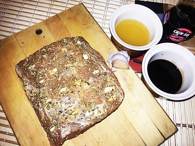5. Приготувати соєвий соус. Рясно полити їм шматок свинини. Частина соусу стіче у тарілку, але нічого страшного. Коли нижня частина насочиться ним, можна буде перевернути м’ясо на інший бік.