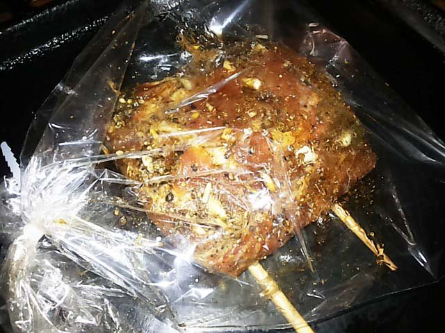 9. Духовку розігріти до 180 градусів і поставити в неї м’ясо. Помістити його можна на лист або у форму. Якщо використовуватимете деко, то покладете під пакет дві – три китайські дерев’яні палички. Це потрібно для того, щоб пакет не пригорів.