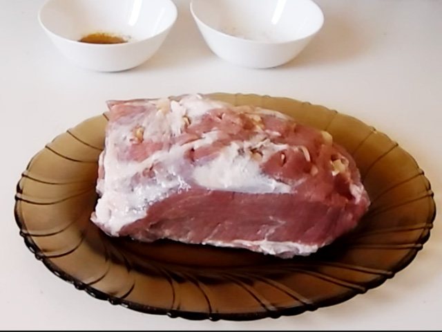1. Свинину помийте та обсушіть паперовими рушниками. Очистіть 5-6 зубчиків часнику, наріжте їх платівками. У м’ясі зробіть невеликі надрізи і вставте часник.