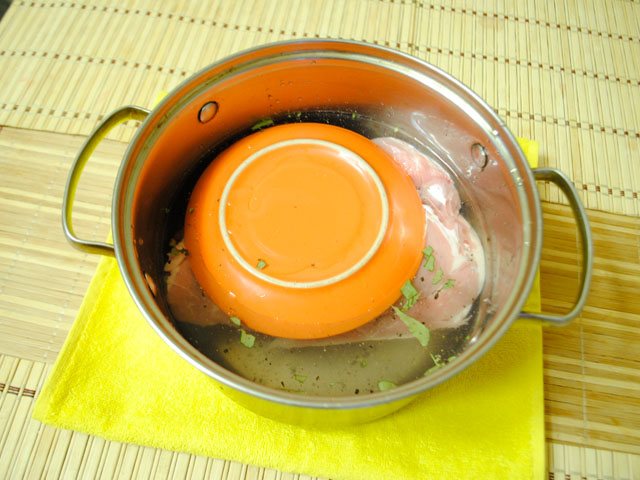 3. Придавити м’ясо блюдцем і залишити солитися на 3-4 години. Прикрити каструлю чи миску харчовою плівкою чи кришкою.