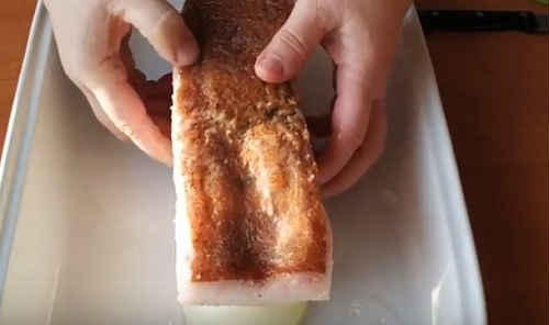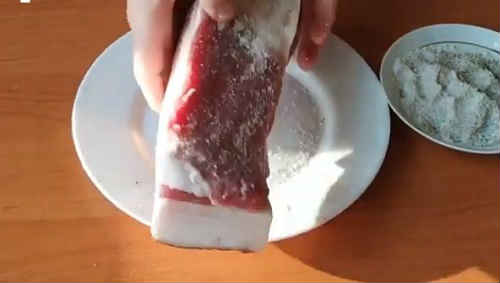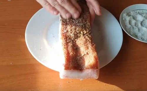 - Натріть шматок засолювальної сумішшю, покладіть на середню полицю холодильника. Маринуйте 4-5 годин.