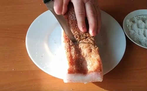 - Змішайте в мисці сіль з цукром, відміряйте половину. Натріть шматок грудинки з усіх боків, залиште на добу за кімнатної температури.