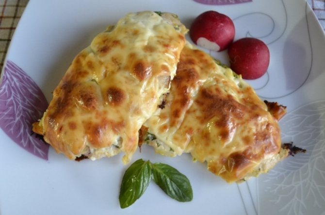Інгредієнти: філе куряче – 2 шт, печериці – 200 г, сир – 100 г, цибуля – 1 шт, часник – 1 зубчик, сметана, сіль, перець.