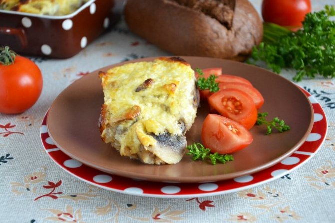 Поверх сметани викладаємо пересмажені із цибулею гриби, посипаємо сиром і запікаємо 20-35 хвилин залежно від товщини шматків. Головне – не пересушити м’ясо!