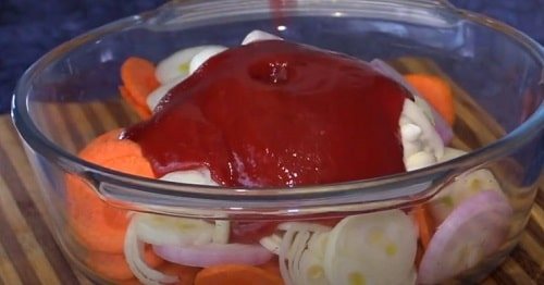 Складіть овочі у спільну миску, залийте кетчупом та майонезом. Добре перемішайте.