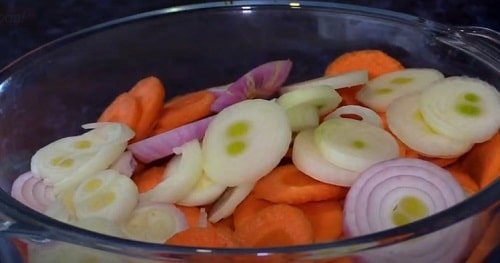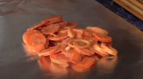 Розстеліть на столі листок фольги (якщо не впевнені в його фортеці, зробіть подвійний фольгу). Викладіть частину овочів, зробивши підкладку.