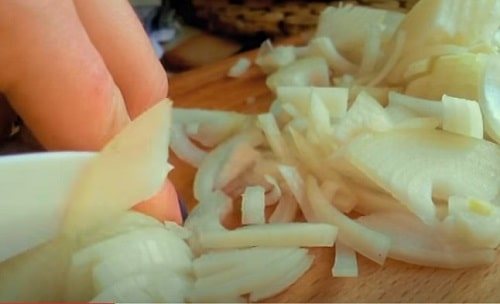 Покришіть цибулю півкільцями чи середнім кубиком.