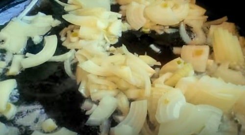 Добре розігрійте на сковорідці олію. Викладіть цибульну нарізку. Пасеруйте кілька хвилин, до легкої рум’яності.