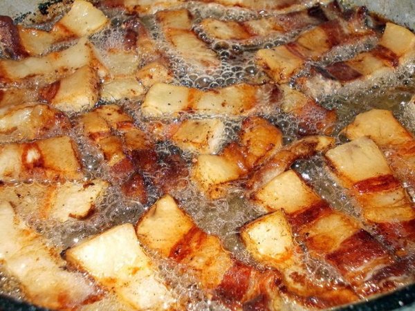 - Грудинку або сало нарізають невеликими скибочками, довго витоплюють на мінімальному нагріванні, видаляють шкварки. Зі свинини ножем зчищають маринад, включають максимальне нагрівання і відправляють ребра на сковороду.