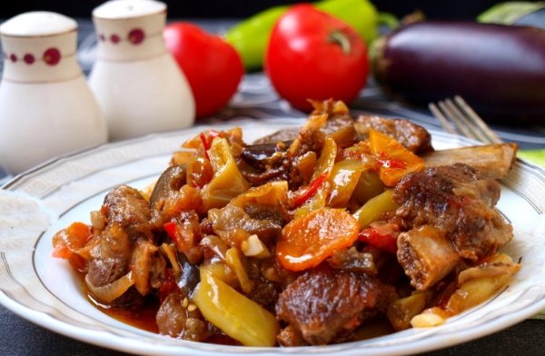 - Далі вогонь трохи збільшують, із 3-хвилинним інтервалом у сковороду відправляють вузькі скибочки перцю, потім нарізаний брусочками баклажан. Готують до розм’якшення всіх овочів, потім нарізають часточками та закладають помідори.