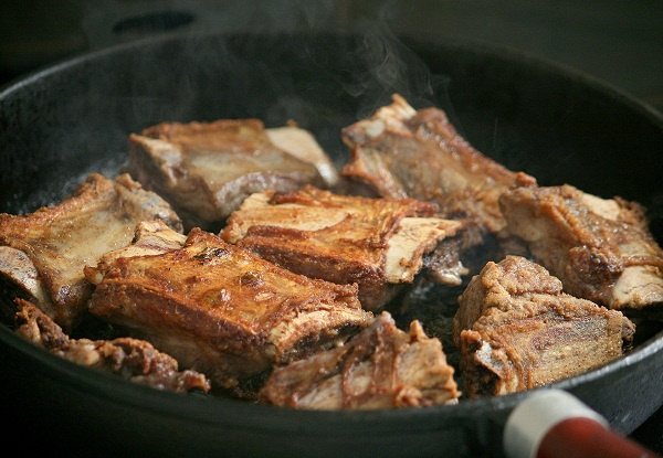 - Вливають масло, а як тільки в його шарі з’явиться велика кількість дрібних бульбашок, кладуть на сковороду реберця, смажать на високому вогні, перевертаючи і не дозволяючи підгоряти.