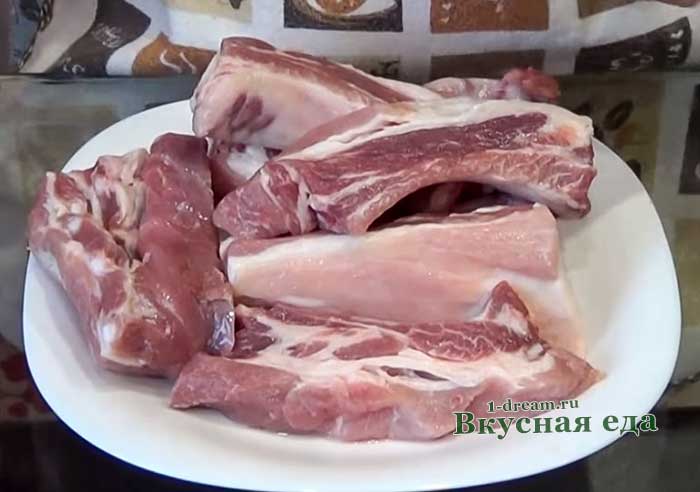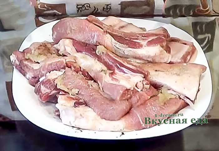 - Свинячий жир при обсмажуванні можна замінити маслом, але на смальці страва виходить ніжніше. Ребра готують до маринування – нарізують на порційні шматки, промивають і обсушують, жирну грудинку поки що відокремлюють.