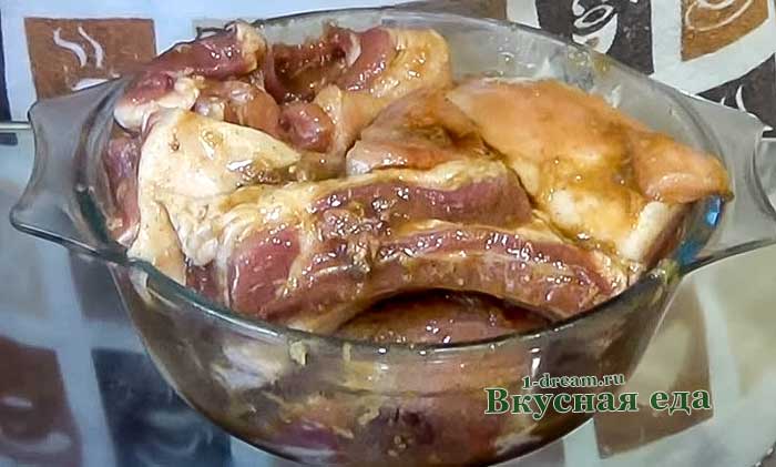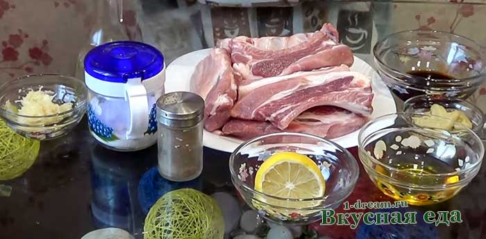 Соковитий шашлик можна приготувати не тільки зі свинячого ошийка. Не менш смачною стравою виходить зі свинячих реберець. Маринад йому готується дуже просто. Рецепт розрахований на 1,5–1,7 кг молодих свинячих ребер. Покрокове приготування полягає в наступному: