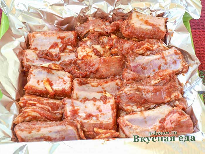 Реберця треба помити, розрізати і перемішати з приправами, дати постояти 30-40 хвилин.