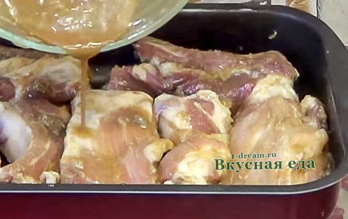Викласти свинячі реберця в глибоку чашку і залити медово-соєвим соусом, ребра, простежте, щоб усі ребра були в цьому соусі, трохи їх переберіть, перемішайте.