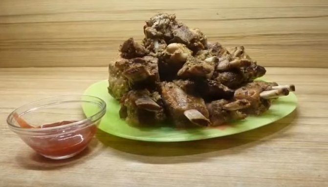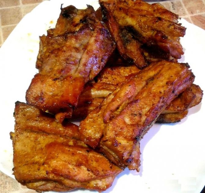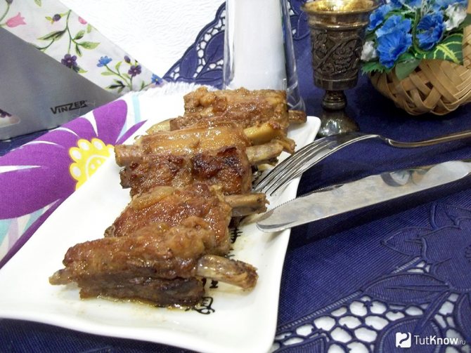 Через годину ребра обсмажують на олії, кладуть у маринад і ставлять у добре розігріту духову шафу. Час приготування годину, температура 180°C . Після цього ваша квартира наповниться ароматом смаженого м’яса – це означає, що страва готова.