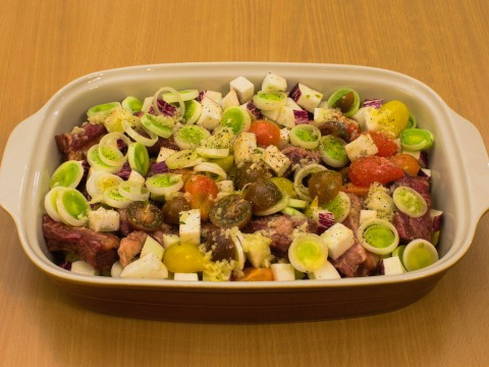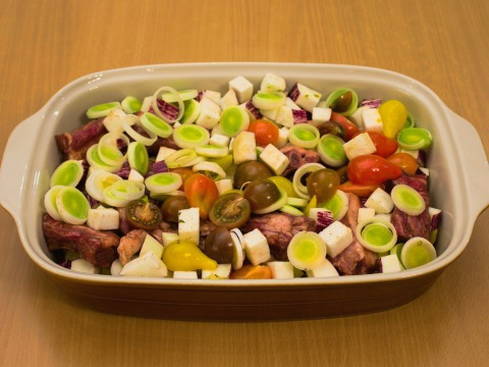 - Мариновані реберця викладаємо у форму для випікання. Зверху розподіляємо овочі.