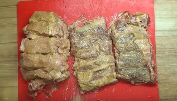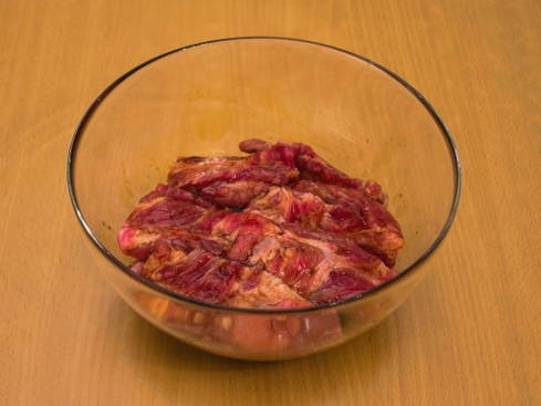 Процес виготовлення відрізняється простотою. Беруть один кілограм м’яса, миють його, промокають серветкою та ріжуть на порційні шматки.