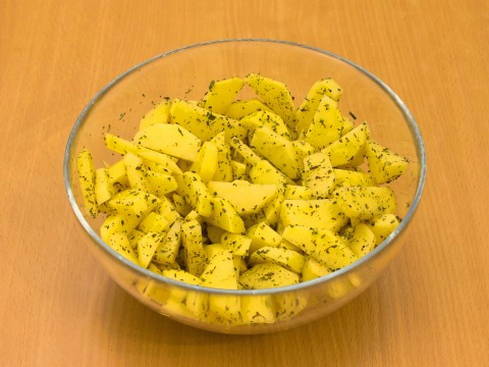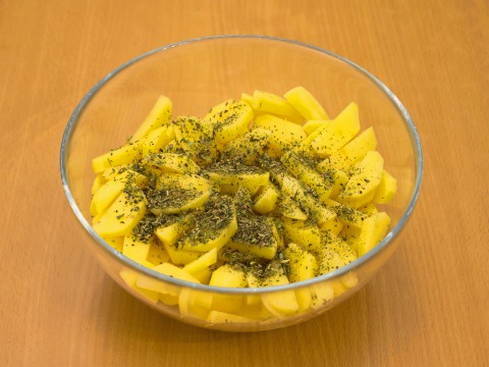 - Посипаємо картоплю сушеними травами та невеликою кількістю солі.