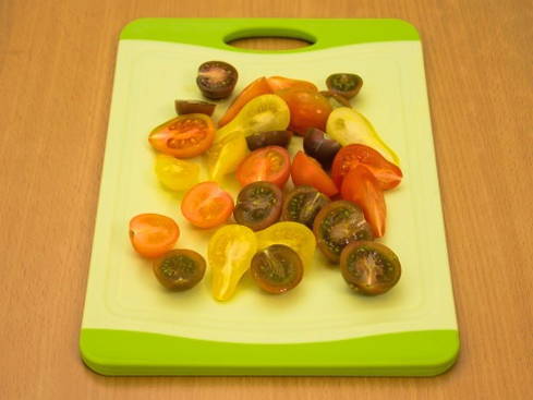 - Помідори поділяємо на 2-4 частини. Залежить від розміру.