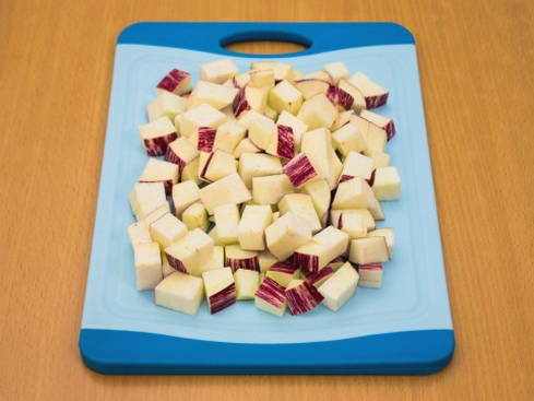- Від насіння та шкірки очищаємо баклажан. Обробляємо його на невеликі кубики.