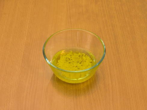 - В окремий посуд вливаємо олію. Розмішуємо в ньому сіль та мелений перець, продавлюємо зубчики часнику.