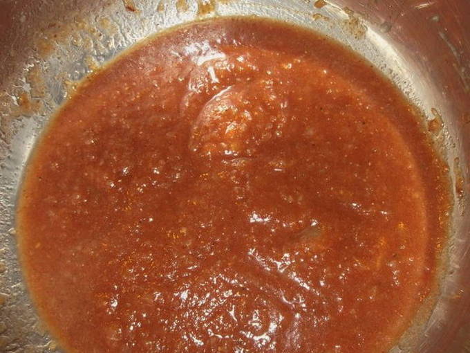 - У глибокому посуді з’єднуємо яблучне пюре з томатною пастою. Сюди ж додаємо цукор, спеції та соєвий соус. Ретельно перемішуємо масу.