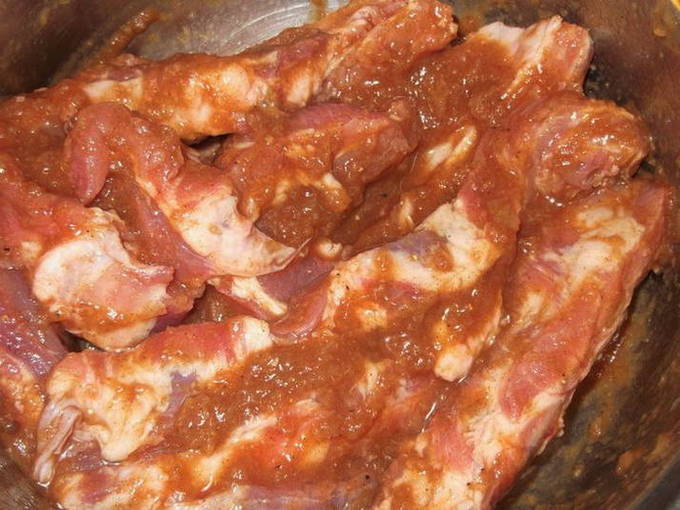 Інгредієнти змішують і ретельно розтирають до отримання однорідної маси, додають сіль та цукор до смаку. Додають 100 г свіжого соку апельсина або грейпфрута. За відсутності фруктів можна скористатися соками із торгової мережі. У м’ясо заливається маринад і протягом трьох годин продукти перебувають у холодильнику. Страва вийде смачніше, якщо реберця промаринуються цілу добу , при цьому посуд з ними потрібно періодично струшувати.