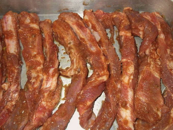 Попередньо вимите та просушене м’ясо розрізають на шматки. Для приготування маринаду змішують 200 г пива з двома столовими ложками меду та додають три попередньо подрібнені цибулини. Солять і перчать, орієнтуючись на власний смак. Ребра заливають маринадом і на годину ставлять під гніт.